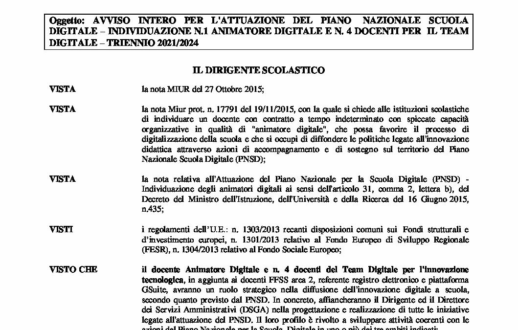 Avviso di selezione per Animatore Digitale e componenti team digitale da NAMM0A100C | Set 6, 2021 | area docenti